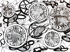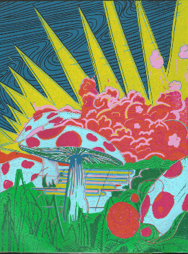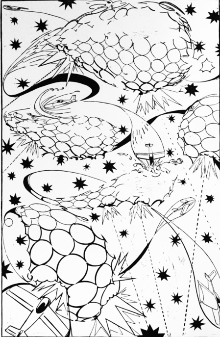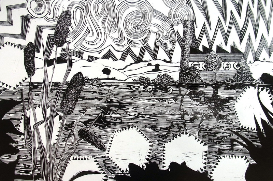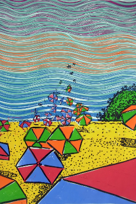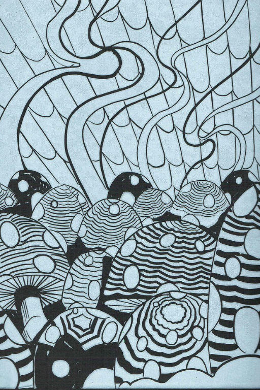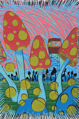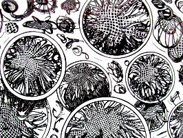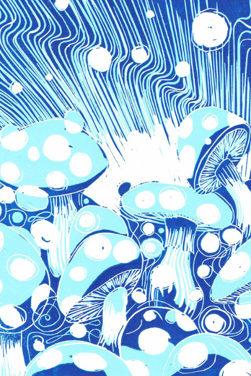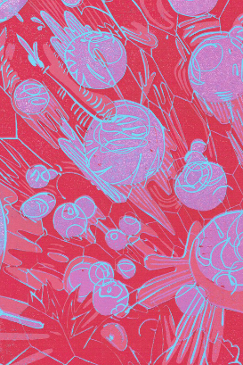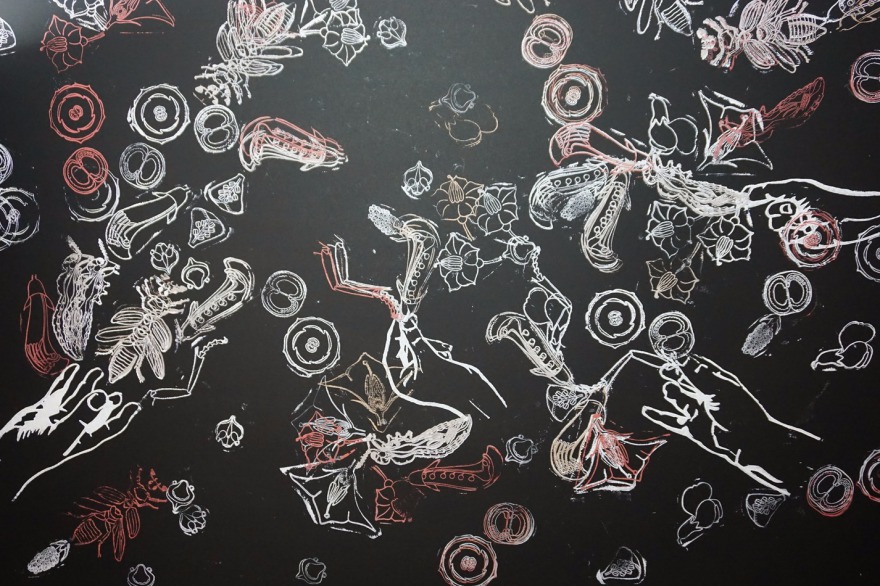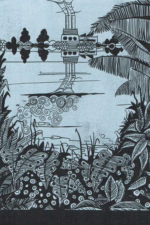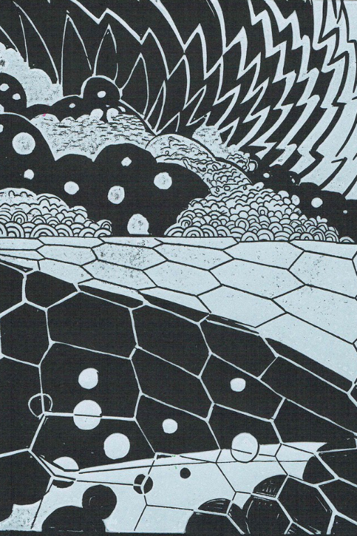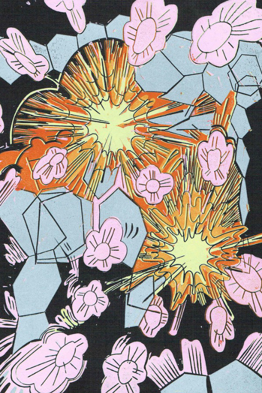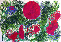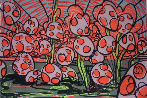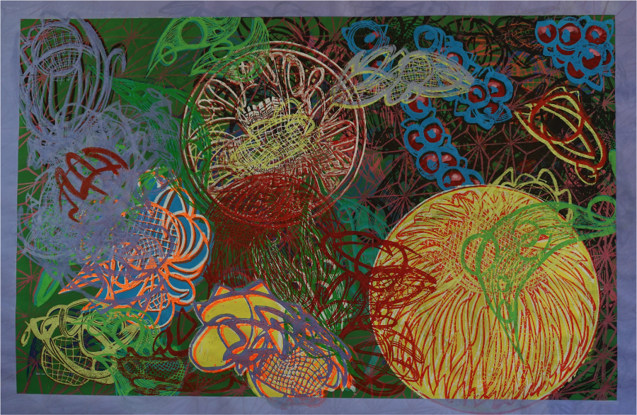 Wie in einem realen Garten Pflanzen üppig wuchern, erlaubt das prozesshafte Arbeiten im Lino-Cut mit Handdruck ein Ausufern in jeder Hinsicht. Aus sich überlagernden Schichten verschiedener vegetabiler Motive, allesamt geschnitzt aus einzelnen Linolplatten, füllt das Blatt ein Allover aus bunten, leuchtenden Formen. Wie ein Gärtner züchte ich mir schrittweise ein Arsenal an neuen Pflanzen heran. Die Beschränkung des Papierformates ist aufgehoben. Großformatige, vielfarbige Unikate sind das Ergebnis.